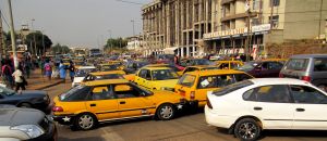 Merci Seigneur, Oxygen, La Main de Dieu, La Verdict Céleste, La Route Tranquille, Allah Takes Care, La Vie est un Mystère, Special V.I.P., Bony, Air France Privé…. Op de benenwagen na is de taxi in Yaoundé het meest populaire vervoermiddel. De taxi is talrijker dan de gewone personenauto, vlug, voordelig en verre van veilig. Net als in New York herkenbaar aan de gele kleur, maar daarmee eindigt de overeenkomst. Taxi’s zijn klein van stuk, meestal van het merk Toyota en doorgaans flink gebutst en gehavend. Vele hebben een naam of boodschap op de bumper geschilderd, sommige poëtisch van aard, sommige met profetische waarde. De Allerhoogste wordt veelvuldig aangeroepen en je begrijpt meteen waarom. Prudence, een zeer populaire uiting, blijkt geen naam doch een waarschuwing aan medeweggebruikers. Beeldbepalend scheuren ze door de straten met een nimmer nageleefde limiet van 60 km per uur. Van rijvaardigheid kan niet worden gesproken. Richting aangeven gebeurt, net als stoppen voor het stoplicht, op vrijwillige basis en bij hoge uitzondering. Levensgevaarlijke inhaalmanoeuvres -linksom, rechtsom of net voor de bocht- zijn de norm. Voorrang bestaat niet, wel geldt het recht van de sterkste. Er wordt, uiteraard zonder aanwijzing daartoe, overal gestopt om in en uit te laden, zelfs midden in tunnels. Absurde verkeersopstoppingen ontstaan door de hardnekkige weigering plaats te maken, ookal zou dat fysiek mogelijk zijn. Met maar liefst 5 zitplaatsen in de aanbieding -naast die van henzelf- schuimen taxichauffeurs de stad af op zoek naar cliëntèle. Deze wordt gelokt door in het voorbijgaan luid te toeteren, ten teken dat er nog plaats is in het vehikel. Met een enkel armgebaar geeft de voorbijganger aan dat hij vervoer zoekt. Wie al een plaats heeft moet inschikken. Mocht de baggage benevens uit tassen bestaan uit kasten, fietsen of grote trossen banaan, dan is dat geen probleem. Op wonderbaarlijke wijze past alles in de kofferbak, ook al moet er af en toe halt worden gehouden om de zaak op z’n plaats te duwen. Ons wordt geadviseerd geen taxi te nemen. Het kost geen enkele moeite aan deze oproep gehoor te geven.