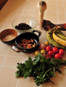 Genevieve kan je gerust om een boodschap sturen. Als ze ‘s ochtends hijg en puf binnenkomt is de oogst formidabel. Behalve tomaten, ui, pepers en gedroogde komkommerzaadjes komen een gargantueske paddestoel, verse larven en gerookte rupsen uit het mandje, dit alles voor de lessen inheems koken die ze me geven gaat. Voor de rupsen heeft ze de halve stad afgestruind want het seizoen is reeds voorbij. De larven, twee vingerkootjes lang en lekker dik, wriemelen inmiddels vreedzaam in een bakje door elkaar. Het zijn de weldoorvoede nazaten van de Scarabee, zegt Genevieve, die zijn niet zo moeilijk te vinden. Ze houden zich op in het zachte binnenste van de oliepalm, alomtegenwoordig in deze contreien. De bijna nuchtere maag heeft wat bedenkingen bij het aanschouwen van de levende have. Ach kom, zegt Genevieve, niet bang zijn, hier, voel maar, ze zijn lief. Met enige aarzeling aai ik de vriendjes in het bakje, ze zijn zacht, dan pak ik er twee in de hand, waar ze rustig doorwriemelen. Eerste horde genomen, denk ik, terwijl mijn maag enigszins samentrekt. Je kunt rationeel gezien nog zo bereid zijn dit alles te proberen, maar het fysiek reageert primair afwerend. Alsof er een wezenlijk verschil is met een garnaal, denkt het hoofd. En: tweederde van de wereldbevolking is dolblij met een maaltje van dit eiwitrijke voedsel. Klonk, zegt de maag. De rupsen zijn zo dood als een pier, gerookt op een houtskoolvuur. Levend zal je ze op de markt niet aantreffen, ze zijn zo verdraaide beweeglijk en niet te houden, kruipen overal heen. Je zou als marktkoopvrouw geen tel rust hebben met die beesten. We wassen ze goed -er heerst cholera in het noorden dus extra aandacht voor de hygiëne- en doen ze vervolgens in kokend water. Het is nodig om de haartjes eraf te laten weken, daarvan krijg je anders prik in de keel. En de rooksmaak moet er ook een beetje af, want anders proef je de rups als als zodanig niet goed. Gaan we al dat heerlijks vandaag opeten? Nee, de rupsen kunnen we na behandeling nog wel even bewaren en de reuzepaddestoel ook. Die laatste ontspruit in de kamers van termietenheuvels, waar ze met name in het natte seizoen gedijen. Jaja, die termieten. Behalve dat ze eiwitrijk zijn, tussen de kiezen kraken en nergens speciaal naar smaken hebben ze een heel nuttige functie. In Afrika schijnen rond de 330 soorten termieten voor te komen die in hun kolonies monoculturen van paddestoelen bewerken. Die culturen kunnen tientallen jaren oud worden en geven jaarlijks een rijke oogst aan paddestoelen. Zie je wel, meent Genevieve, elk creatuur, hoe klein het ook is, heeft zijn bijdrage aan het bestaan. Daar heeft de goede God in al zijn wijsheid maar mooi in voorzien. De larven zijn niet zo lang houdbaar, zonder eten gaan ze dood, levend in de ijskast wil ook niet en laten bederven zou zonde zijn, want ze kosten nogal wat, omgerekend €1,50 voor een handjevol. Allez dan maar, na een laatste blik op de krioelende massa snijdt Genevieve de beestjes zonder pardon doormidden. Ze blijven hardnekkig bewegen totdat ook het kopje eraf gaat, dan rest er niets dan een velletje waarin een gele substantie drijft. Caca zit er niet in, dat valt mee. Voila notre delicatesse! We maken een mooi beslag van geroosterde en gemalen komkommerpitten, vermengd met water. Er gaat basilicum bij en een klein beetje pili, rode peper die gemeen kan steken op de tong maar die de smaak zo goed omhoog haalt. Een rauw ei zorgt voor de nodige luchtigheid, een flinke dot zout zorgt voor extra smaak. Als laatste gaan de larven door het mengsel. Voor de finishing touch haalt Genevieve beneden een groot bananenblad, dat ze vakkundig ontleedt en in stukken hakt. Boven het fornuis wordt het blad zachtgemaakt zodat je het makkelijk kan vouwen. Daar gaat het beslag in, let op, er mogen geen gaatjes in zitten. Het pakketje wordt samengebonden met wat sisal, dat ook van de bananenboom is afgehaald. Jullie zouden aluminiumfolie gebruiken, zegt Genevieve. Ja, beaam ik, maar dit is natuurlijk honderd keer beter. Biologisch afbreekbaar en zo voor de grijp op straat. Hier ontwaar ook ik de hand van God. In een grote pan gaat het op het vuur, au bain marie. Het duurt wel even voor het klaar is. Als we ‘s middags het pakketje openmaken is er een sponsachtige cake verrezen. De larvenhulzen steken er als krenten uit. Dit is echt feesteten, zegt Genevieve ter aanmoediging. De oma’s maken ze soms wel zo groot als een watermeloen. Het is op voor je het weet. Ik neem een hap en ben blij verrast door de structuur en de smaak. Het is inderdaad heel erg lekker. De harde restanten larf neem ik graag op de kook toe.
